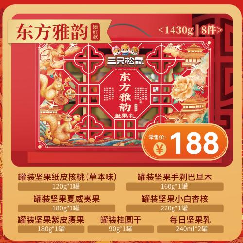 | 三只松鼠罐装坚果礼/东方雅韵臻红款(8件) | 罐装坚果小白杏220g | 1 | 1430g |
